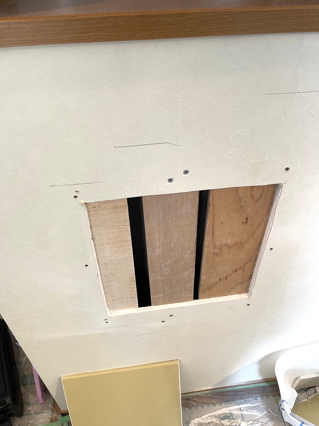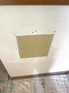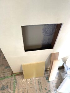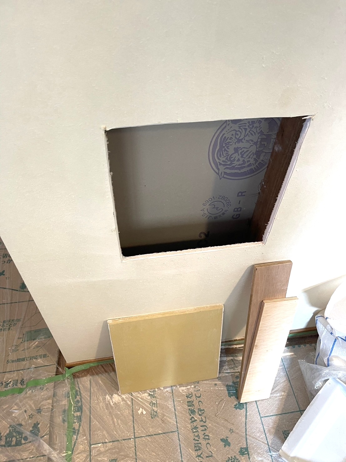 穴の周りをカットしてから板を張りボードを作り壁にしていきます